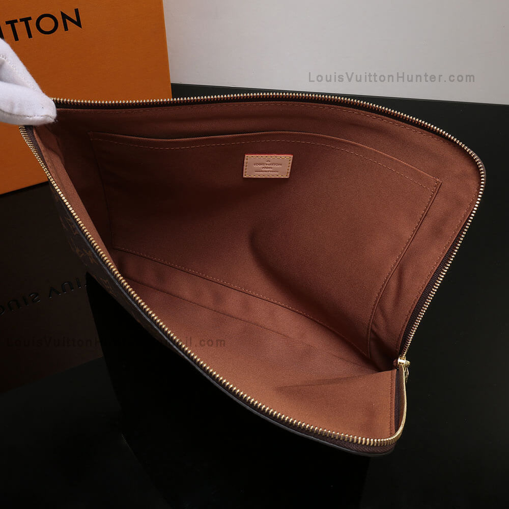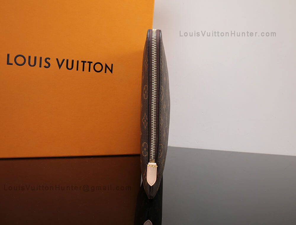 13.4 x 9.4 x 0.8 inches(length x height x width) Coated Monogram Canvas Natural Cowhide Leather trims Textile lining Golden brass metal pieces Simple zipped closure Large capacity Wide opening Interior Slip pocket