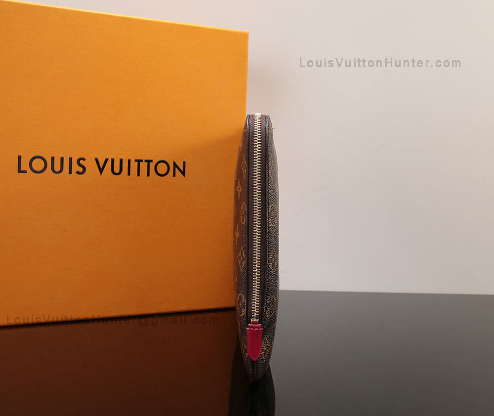 13.4 x 9.4 x 0.8 inches (length x height x width) Coated Monogram Canvas Natural Cowhide Leather trims Textile lining Golden brass metal pieces Simple zipped closure Large capacity Wide opening Interior Slip pocket